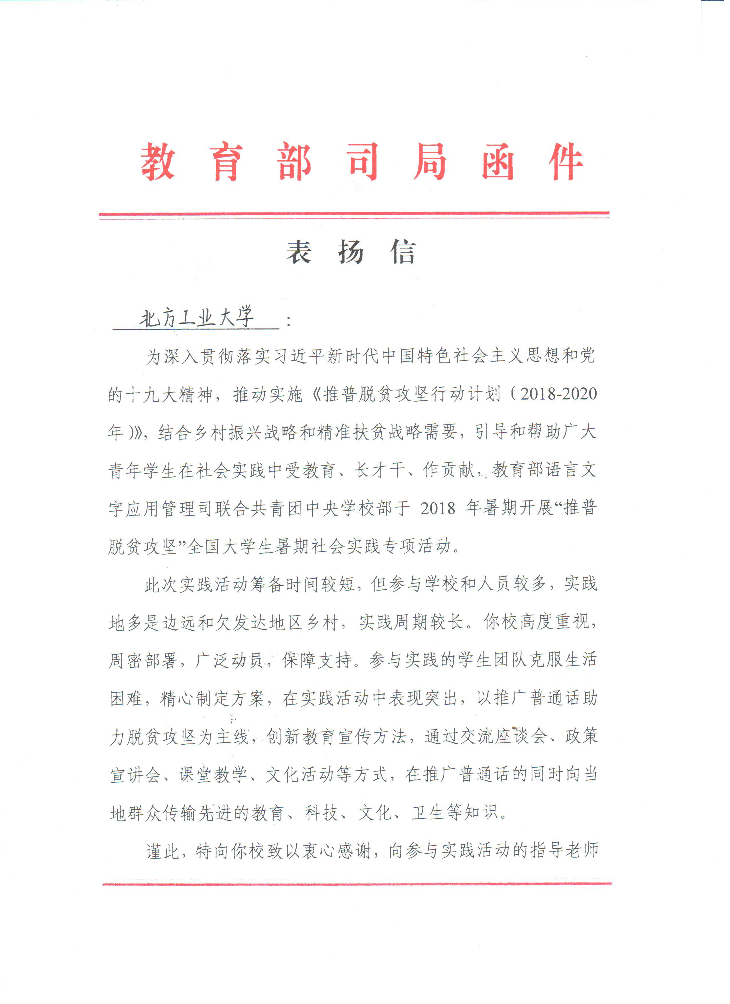 近日,学校收到教育部语言文字应用管理司和团中央学校部发来的表扬信,对永利官网参加2018年“推普脱贫攻坚”全国大学生暑期社会实践的优秀团队提出表扬。今年暑期,由永利官网文法学院牵头,文法学院和经济管理学院7名学生组成的“心系故里”实践团前往新疆和田地区开展了“推普脱贫攻坚”专项社会实践,并被评为2018年全国大中专学生志愿者暑期“三下乡”社会实践活动优秀团队。编辑:单连良责任编辑:左芳