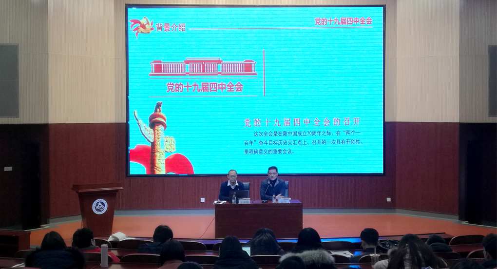 12月26日下午,学校在文化会堂组织开展学习贯彻党的十九届四中全会精神第四次宣讲,马克思主义学院王润稼老师做辅导报告。此次宣讲会由教师工作部、宣传部联合举办,120余名青年博士参加了学习。宣讲会由宣传部副部长尉峰主持。王润稼老师以“治国有道 理政有方——深入学习贯彻党的十九届四中全会精神”为题,对党的十九届四中全会的基本情况进行了介绍,对全会内容进行系统梳理,重点对党的领导制度体系、人民当家作主制度体系...