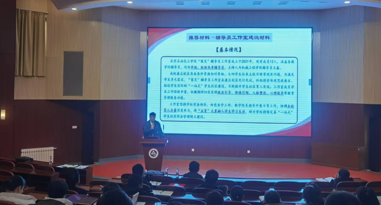 12月19日下午,学工部在文化会堂举办了辅导员发展论坛专题报告会。2023年北京市“最美高校辅导员”、第八届北京高校辅导员素质能力大赛一等奖获得者、北京石油化工学院王鑫老师应邀作了专题报告。学工部副部长史宁主持报告会,学工部、校团委干部和学院副书记、辅导员参加。王鑫老师以“在‘学思践悟’中提升新时代高校辅导员素质能力——以辅导员素质能力大赛为视角”为题,紧密结合工作实际和成长经历,从“强信念——铸魂育...