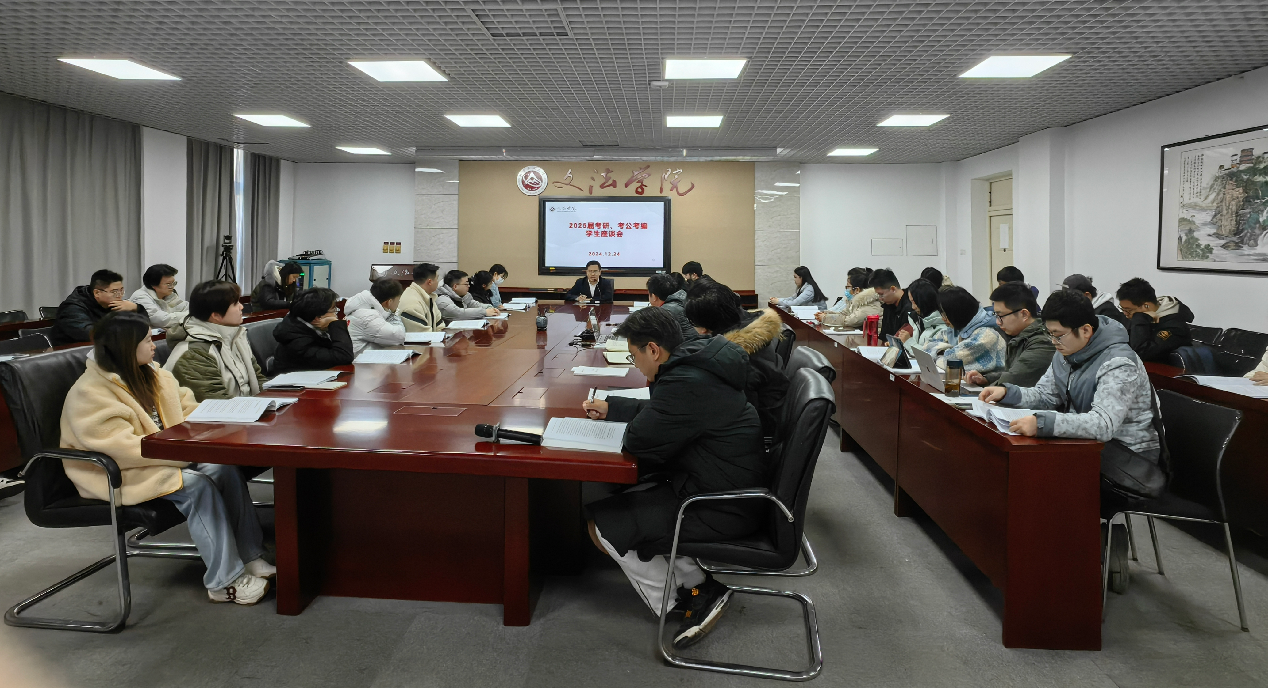 为全面了解考研、考公考编学生考试情况,详细掌握并精准指导考研、考公考编学生下一步发展规划,帮助毕业生调整心态,树立信心,做出合理选择,解决实际问题,12月24日,文法学院召开2025届考研、考公考编学生座谈会。学院党委书记袁凤识、毕业年级辅导员以及近40名学生代表参加会议,会议由学院党委副书记邝洪波主持。座谈会上,每位考研、考公考编学生逐一发言,就个人考研、考公考编情况、毕业论文撰写情况和下一步计划打算...
