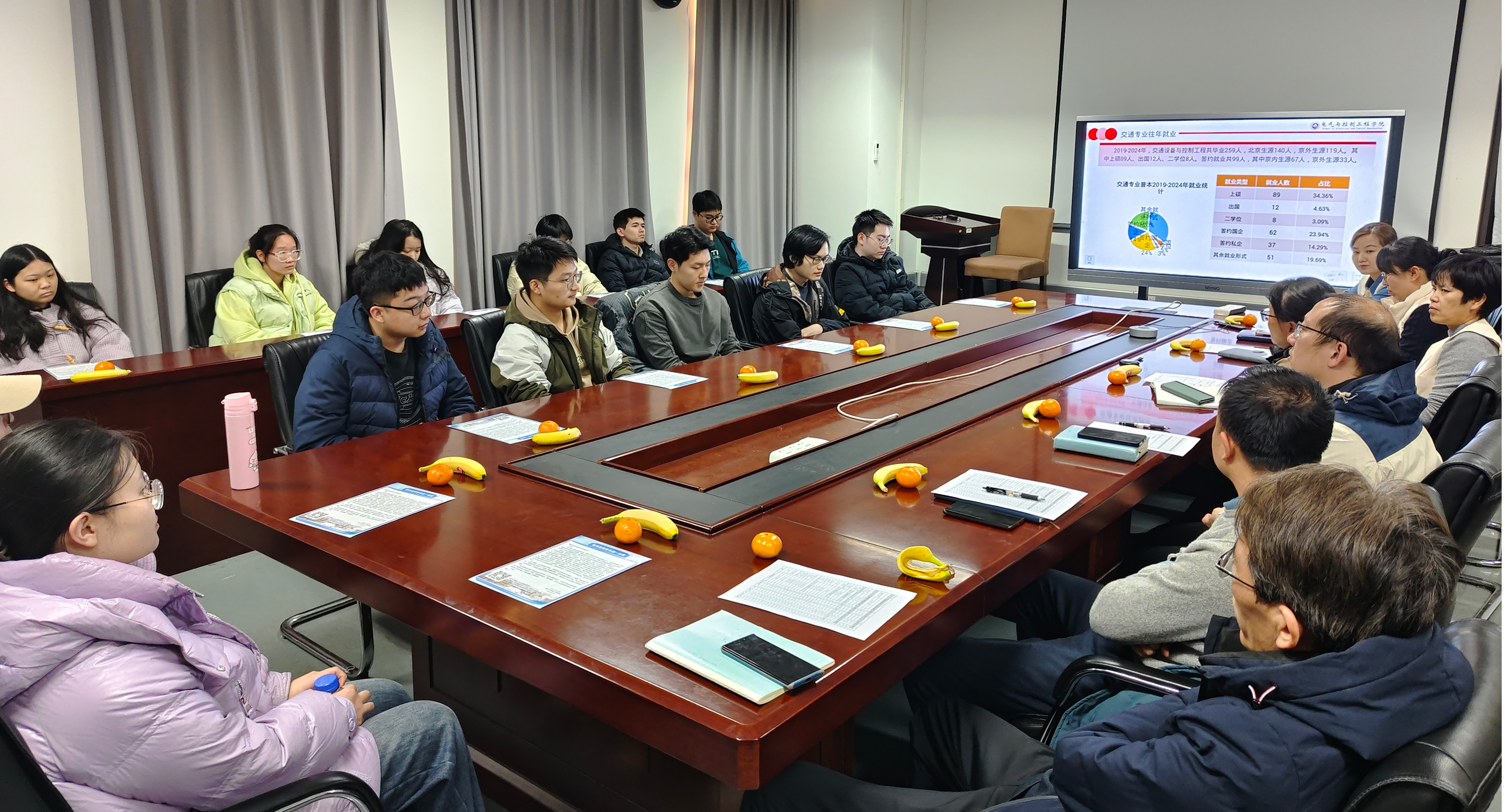 为切实做好考研后学生转化工作,动员学生利用寒假时间积极求职,12月24日,电气与控制工程学院在博远楼554召开交通专业毕业生代表座谈会。电控学院党委书记李颖宏,副院长周慧娟,副书记刘霁炜,交通系系主任刘小明,教师王志建,交通系毕业班班导师,毕业班辅导员,以及20余名交通设备与控制工程专业毕业生代表参加。毕业班辅导员范玥详细分析了交通专业2019-2024年的升学及京内京外生源具体就业信息和就业单位,为同学们提供...