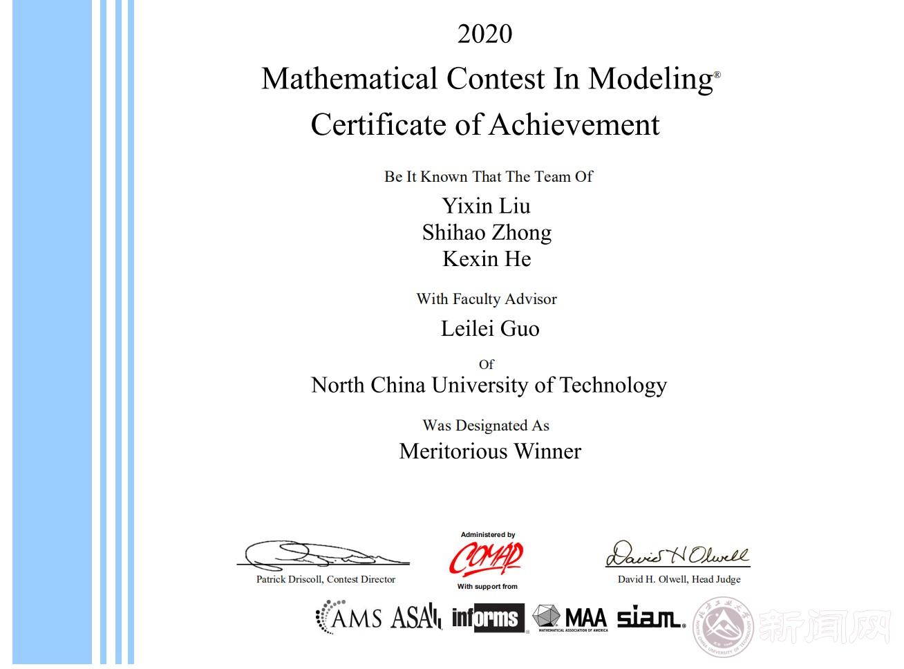 近日,由美国数学及其应用联合会主办的2020年国际大学生数学建模竞赛成绩揭晓。由永利官网郭磊磊老师指导,本科生刘亦心、钟世豪、何可欣组成的团队获一等奖。这是继2009年后时隔11年,永利官网学生再次荣获此项赛事一等奖。