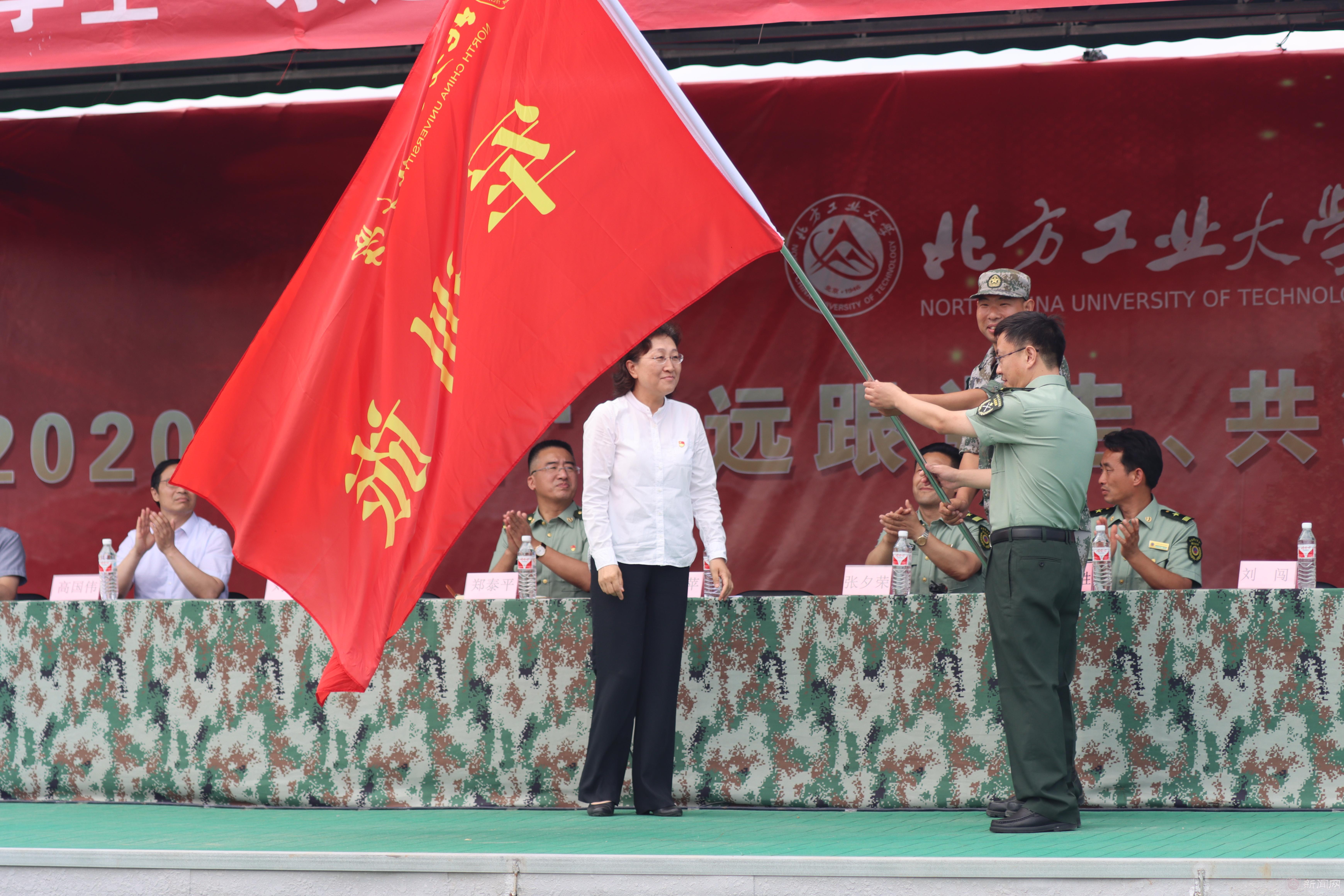 栗苹向军训旅旅长、政委授旗。