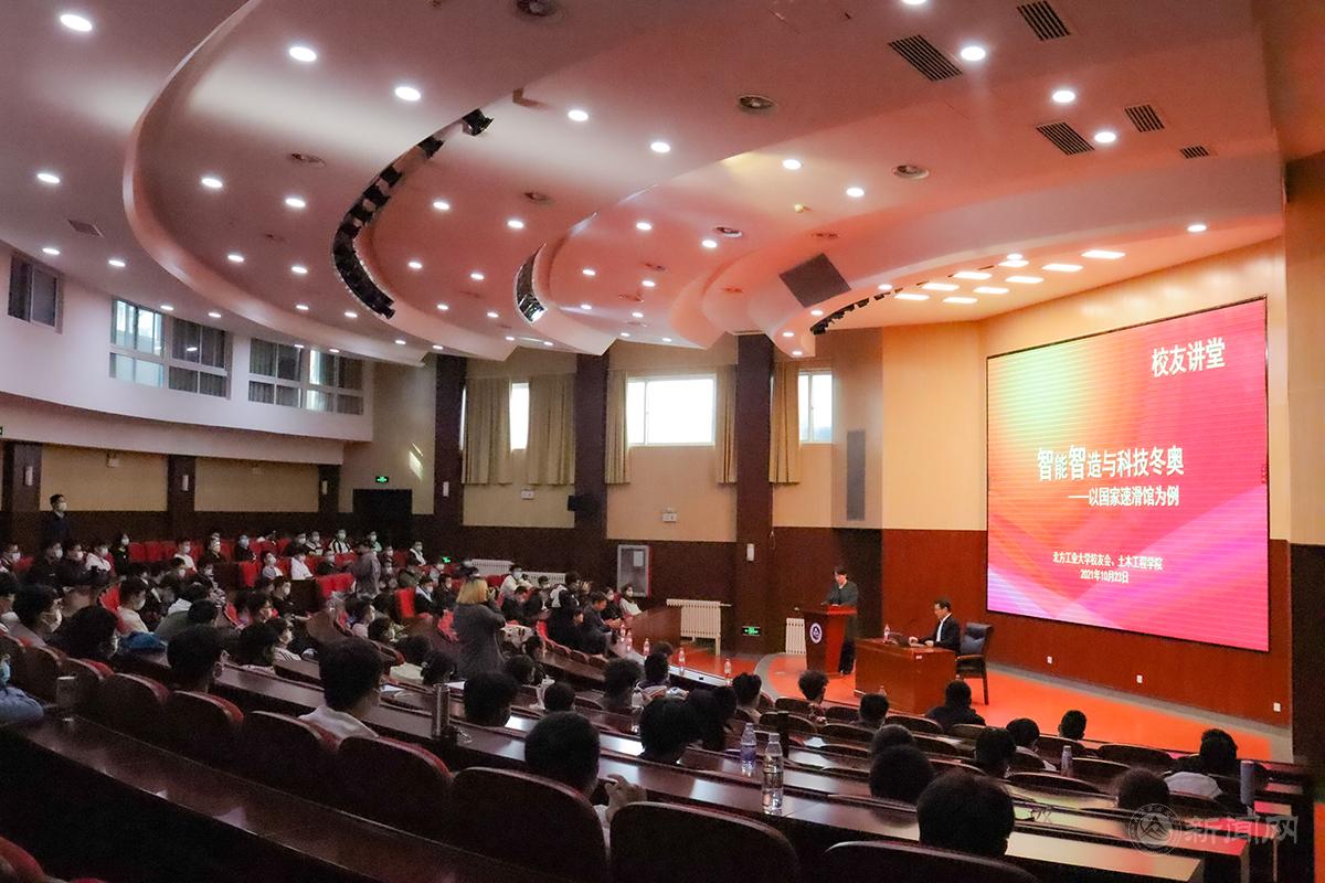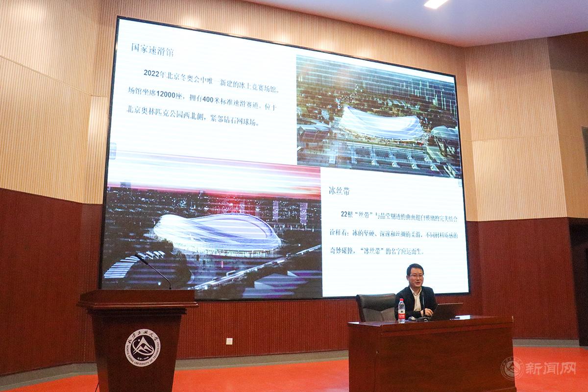 李向南以《智能智造与科技冬奥—以国家速滑馆为例》为题,以智能智造及工业4.0的背景下的科技冬奥讲起,介绍了国家速滑馆被命名为“冰丝带”的由来,进而从外观设计、结构体系、施工方案、创新科技和节能环保等方面详细介绍了智能建造新技术在整个施工过程中的智能化应用。他特别介绍了“冰丝带”建设过程中,技术团队不断创新设计和施工方法,攻克各种技术难题,彰显土木人的智慧、科技创新精神和科技报国情怀。他鼓励同学们在校期间要打好基础,多了解行业现状,找准专业精尖点,不断努力学习,让自己具有更多的可能性,以适应飞速发展的时代需求。