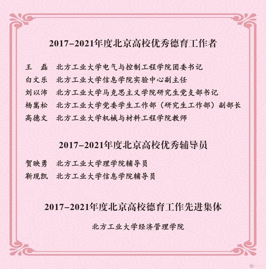 电控学院王磊、信息学院白文乐、马克思主义学院刘以沛、学生工作部杨嵩松、机材学院高德文等5名教师被授予“北京高校优秀德育工作者”称号; 理学院贺映勇、信息学院靳现凯等2名教师被授予“北京高校优秀辅导员”称号,靳现凯同时获得“北京高校十佳辅导员”提名奖; 经济管理学院被授予“北京高校德育工作先进集体”称号。