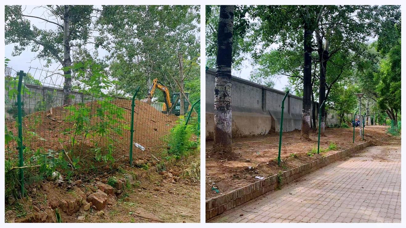 后勤党委在现场踏勘中发现,学校东围墙堆积的种植土边坡角度大,进入汛期可能形成滑塌,堵塞排水管道。服务中心立即行动,租用挖掘机将围墙内20余延米长、近2米高的180立方米土堆全部推平。同时,对东围墙周边堆积的植物垃圾、无主物进行全面清理,铲除区域内的野草植物,美化家属区环境。为扎实做好防汛工作,对校园内全部下水口雨篦子进行地毯式清掏,暑期累计清掏1500余次,消除了防汛风险隐患。