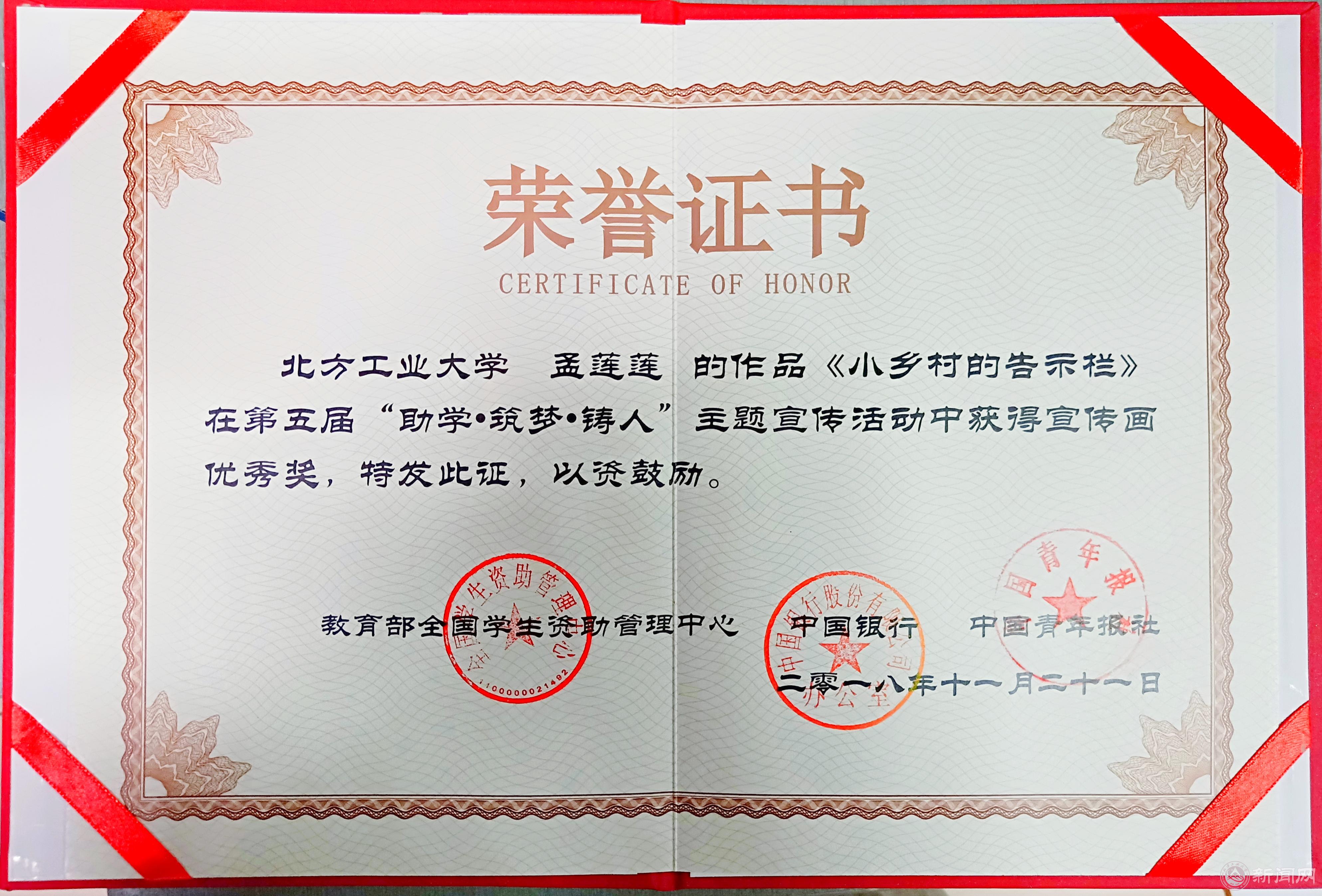11月21日,第五届“助学•筑梦•铸人”主题宣传活动总结大会在中国农业大学东校区举行,永利官网建筑与艺术学院视传17-2班孟莲莲同学的作品“小乡村的告示栏”荣获本次活动宣传画优秀奖。