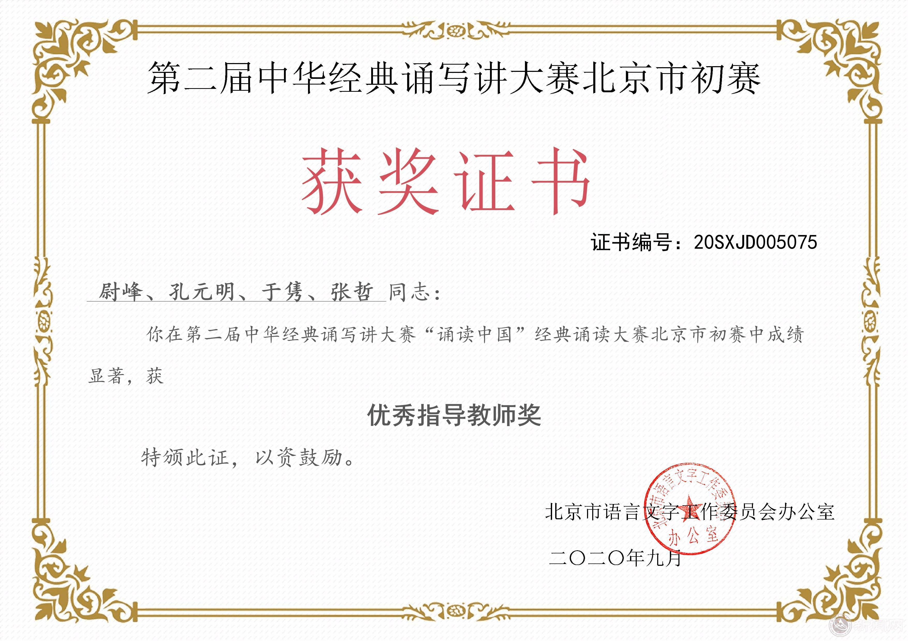 近日,第二届中华经典诵写讲大赛北京市初赛获奖名单公布,永利官网选送的作品《战瘟神》(朗诵者:李文浩、王志健、唐浩然、杨徐子琳、李砚辉、兰青)、《南湖红船》(朗诵者:张若瑶、刘辰茜、李砚辉、唐浩然、李文浩)在“诵读中国”经典诵读大赛中双双获得大学组二等奖,永利官网教师尉峰、孔元明、于隽和张哲获评优秀指导教师。