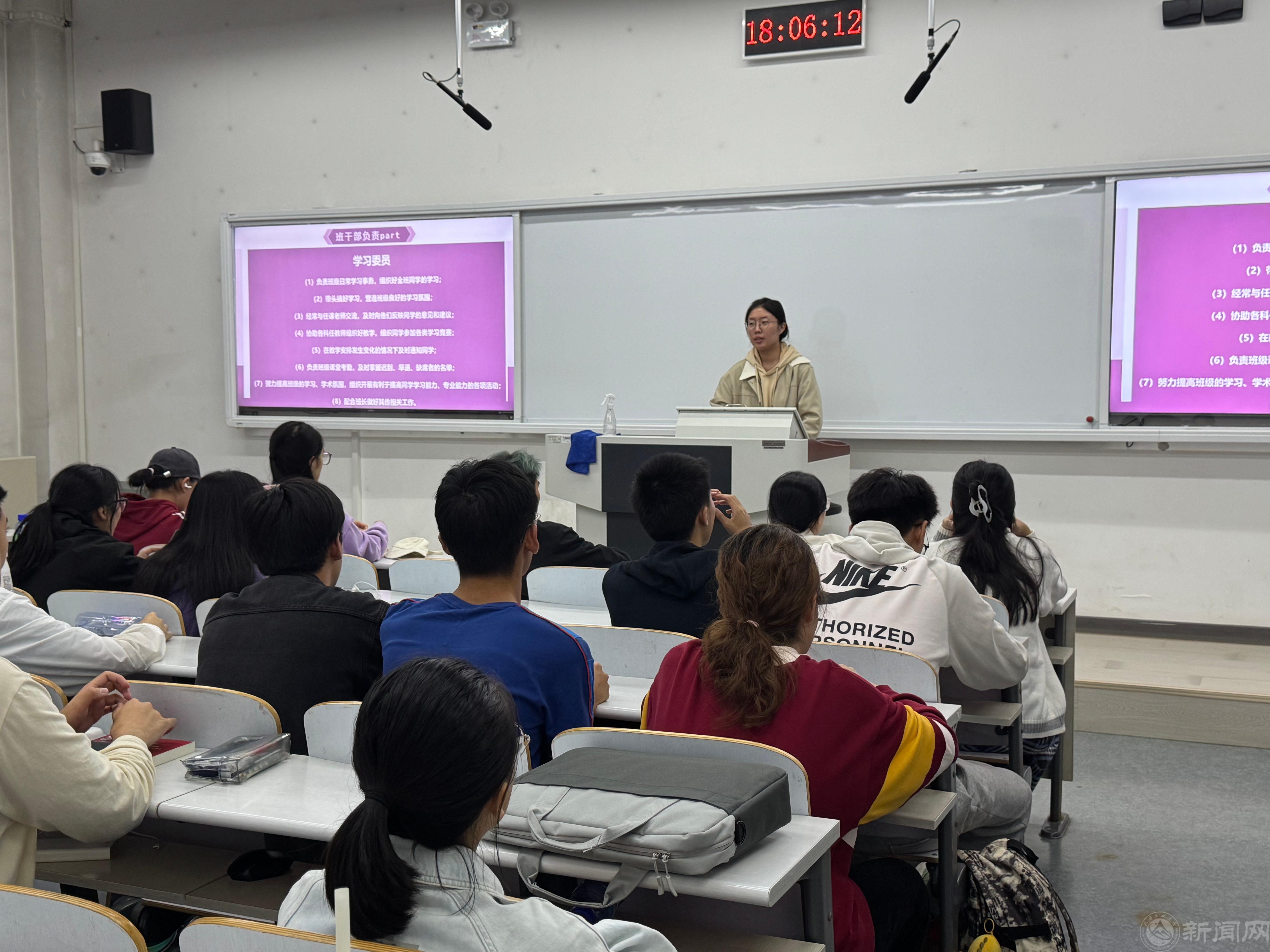 为进一步加强2024级新生班级管理,提升新生班委的综合素质和服务管理能力,帮助班委明确班级工作定位和工作职责,信息学院于10月16日在瀚学203教室开展2024级班委培训会,全体新生班委参加,活动由辅导员王鑫淼、陈煦婷主持。