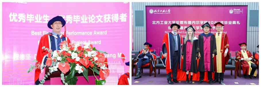 Maozhen Li主持学位授予仪式。102名毕业生依序上台,领取英国伦敦布鲁内尔大学学位证书,随后与两校长合影留念。